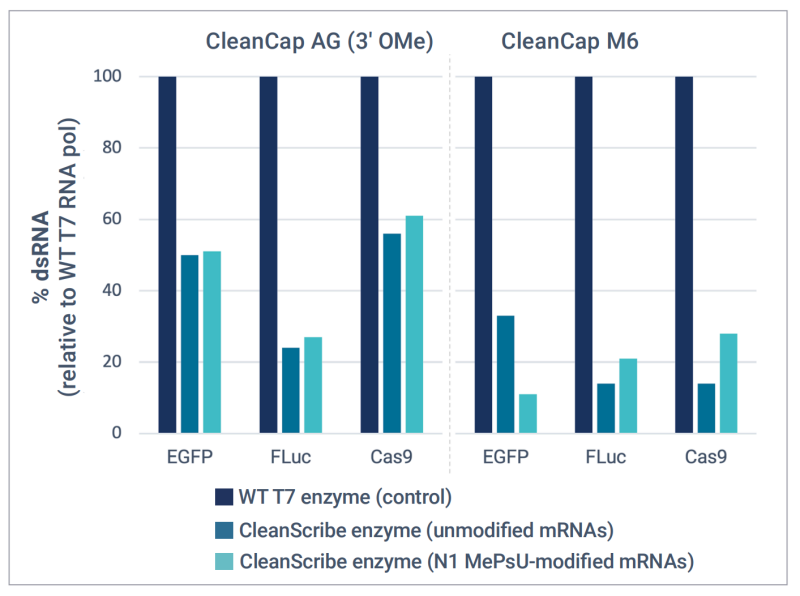图二:TriLink的新型RNA聚合酶可以显著降低mRNA合成过程中dsRNA的形成。在使用 CleanCap AG(3′OMe)和 CleanCap M6 帽类似物合成未修饰或 N1 - 甲基假尿苷(N1 MePsU)修饰的 mRNA 时,CleanScribe™ RNA 聚合酶可显著减少dsRNA的形成。