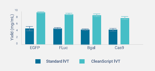 图三:优化的IVT方案可显著提高 CleanCap AG(3’OMe) mRNA的产率。 采用TriLink的CleanScript IVT方案,CleanCap AG(3’OMe)mRNA浓度最高可达10 mg/mL,较传统方案提升高达两倍。