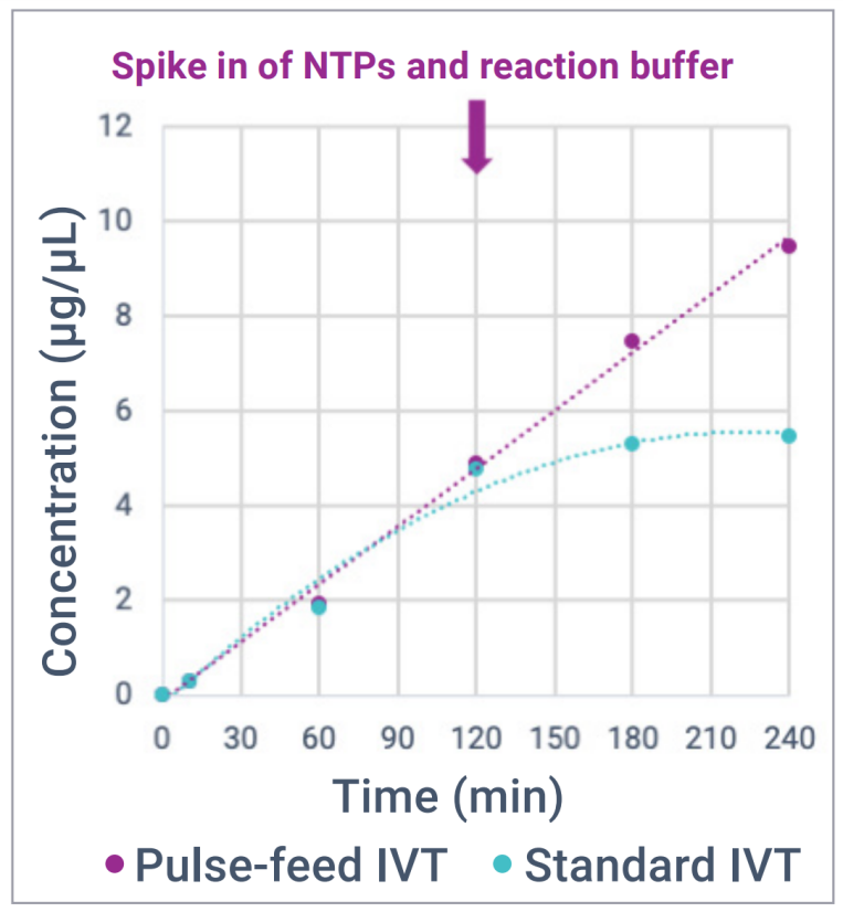 图四:脉冲进料可以进一步提高CleanCap M6 mRNA的产率。 经2h脉冲进料(操作方法参考protocol)后,CleanCap M6 mRNA 的产率最高可达10mg/ml,相较于传统流程提升近2倍。