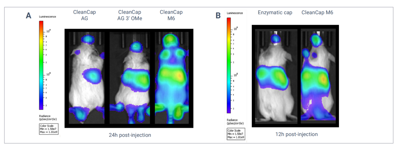 图一:mRNA的帽结构会影响蛋白表达水平。采用 CleanCap M6 帽类似物的mRNA,其蛋白表达水平高于其前代产品(A)及酶法加帽技术(B)。